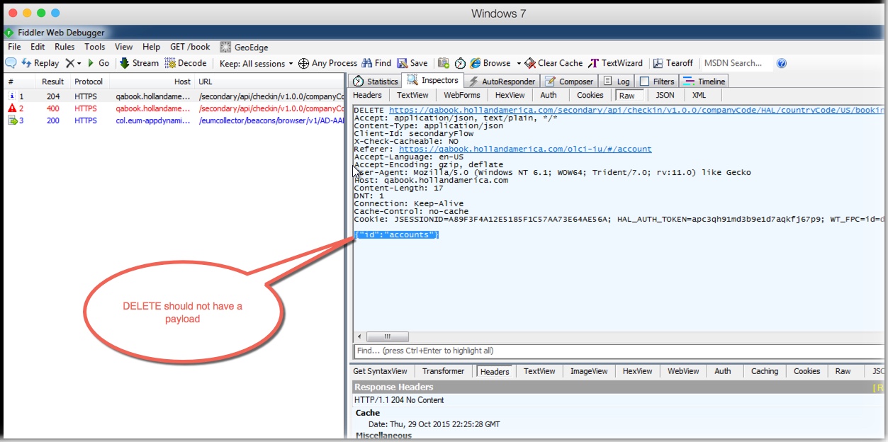• As discussed we can remove the payload from Delete , and will re run the tests to confirm if the issue is fixed.