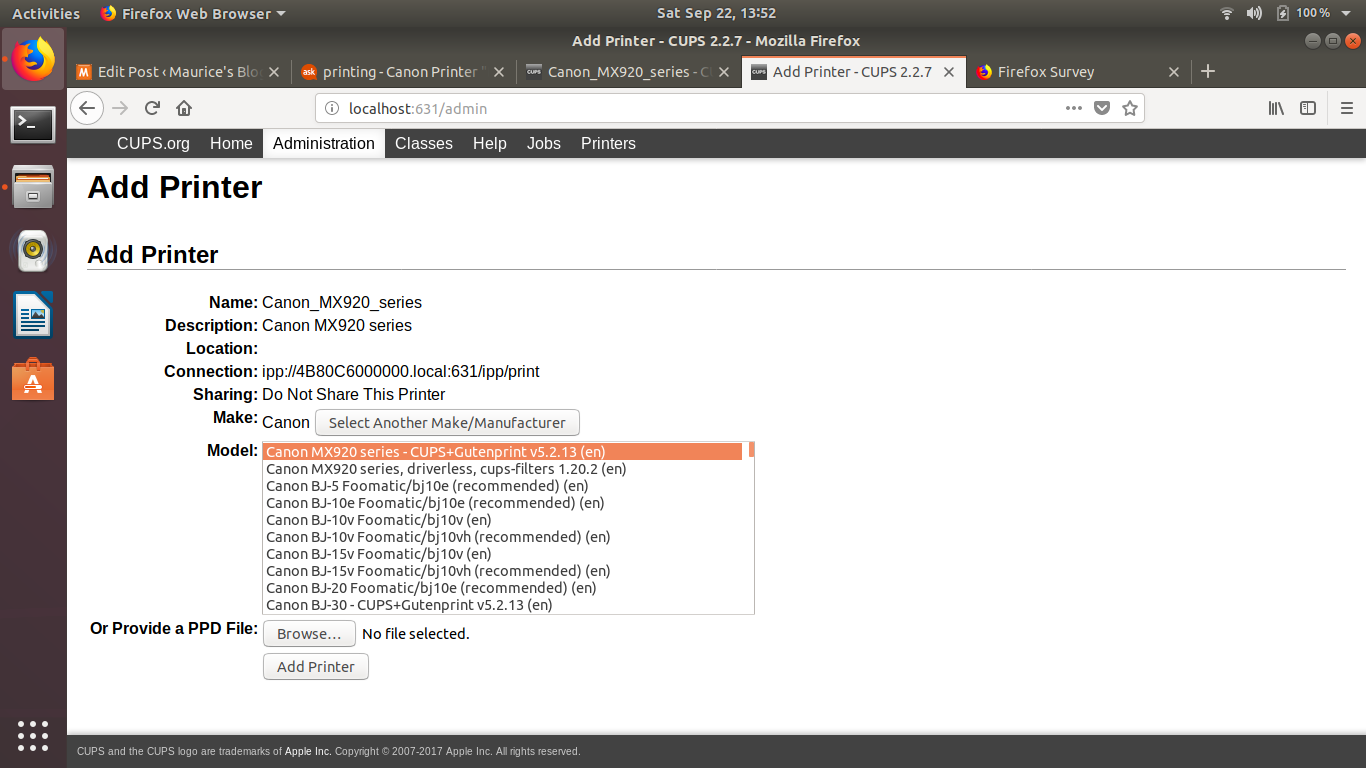 As you go through the settings choose the CUPS option for MX900 and NOT the driverless version. It should look something like: